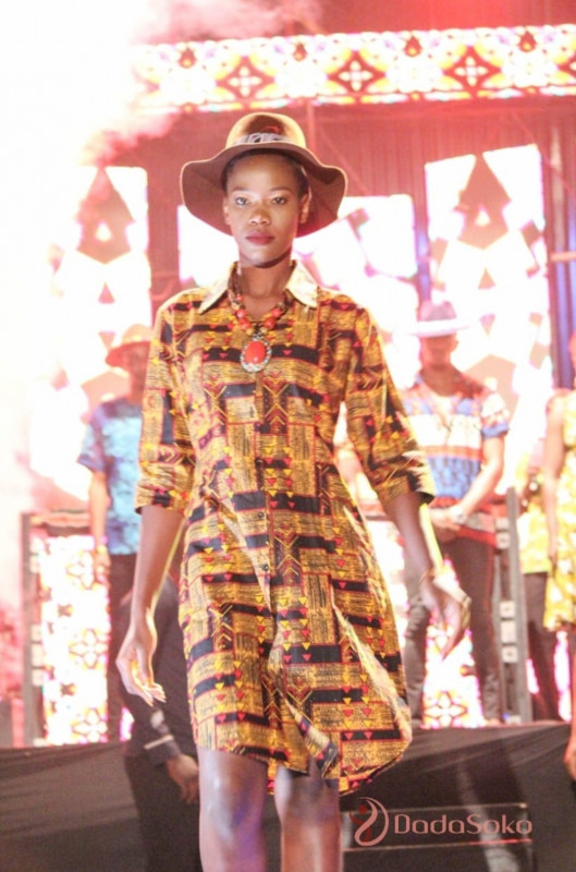Stylish Gold Brown Shirt Dress Top from Nairobi accessorized with Chunky Ruby Red blended necklace from Siaya and matched with Brown Printed Fedora From Nairobi