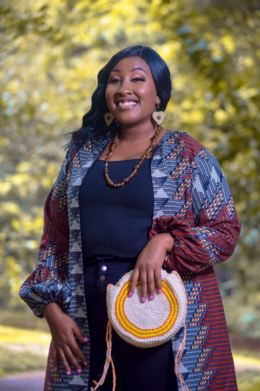 Long-sleeved Ankara Kimono Paired With a Traditional Kiondo Purse and Amber Beaded Necklace.