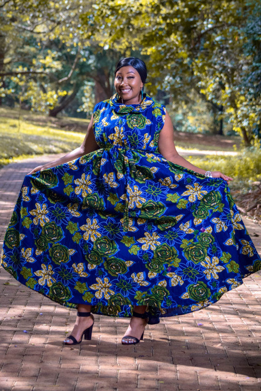 Blue flowered African long dress From Nairobi coupled with African plastic earrings from Kisumu