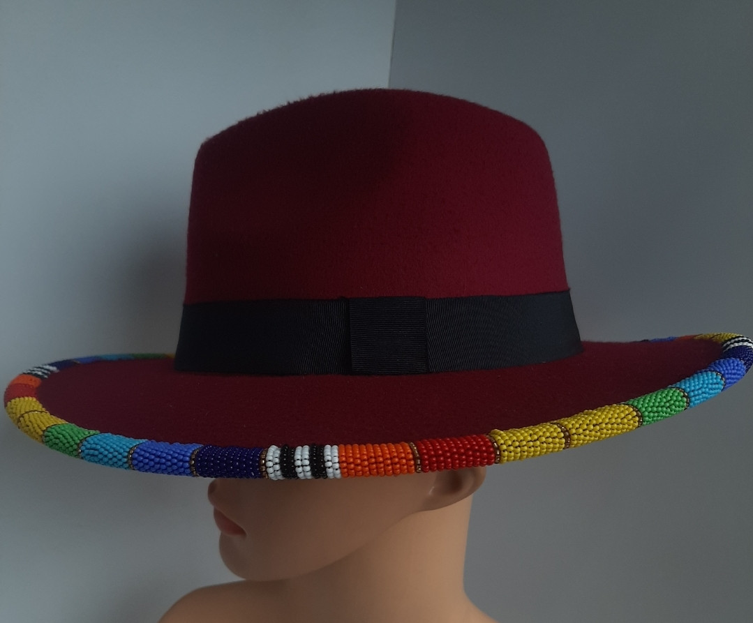 Maroon Styled Fedora Hat With Round Multi-Colored African Beads.