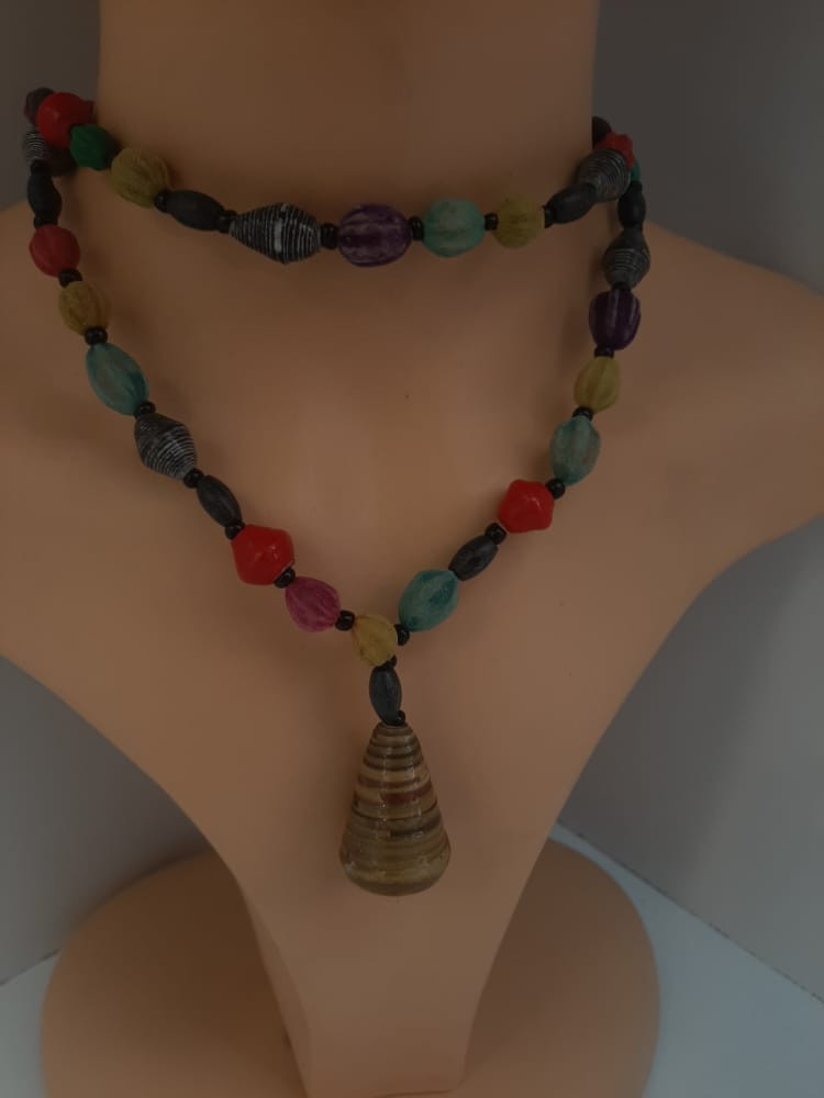 Paper Bead Necklace With Hanging Cone shaped bead.